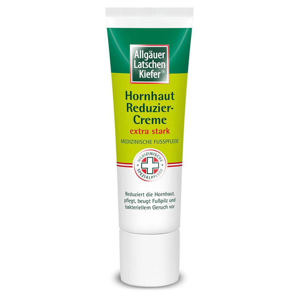 Die Allgäuer Latschenkiefer Hornhaut Reduziercreme extra stark mit der innovativen Anti-Hornhaut-Formel für besonders beanspruchte Hautpartien wurde speziell von Fußpflege-Experten entwickelt. Die wertvolle Wirkstoffkombination mit Fruchtsaäuren, Weidenrindenextrakt und Original Allgäuer Latschenkiefernöl reduziert die Hornhaut innerhalb weniger Tage. Pflegende Inhaltsstoffe wie Shea Butter und Panthenol sorgen für eine spürbar glattere und zartere Haut. Fußpilz und bakteriellem Geruch wird vorgebeugt.