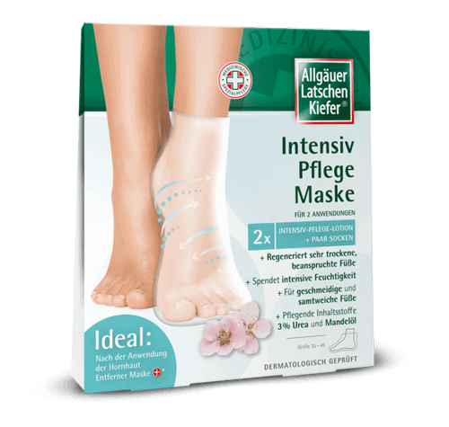 Die Intensiv Pflege Maske von Allgäuer Latschenkiefer ist die Lösung gegen trockene und beanspruchte Füße. Strapazierte Füße werden gepflegt und die Fußhaut wird deutlich weicher und geschmeidiger. Die reichhaltige, flüssige Textur mit pflegenden Inhaltsstoffen wie Urea, Shea Butter, Mandelöl und Panthenol versorgt intensiv Ihre Fußhaut und fördert die Regeneration trockener und beanspruchter Füße. Ausgewählte Inhaltsstoffe spenden der Haut intensiv Feuchtigkeit und sorgen für ein samtweiches Hautgefühl. Unser einzigartiges Allgäuer Latschenkiefernöl wirkt außerordentlich wohltuend. Die Intensiv Pflege Maske wirkt zudem desodorierend für ein langanhaltendes Frischegefühl.