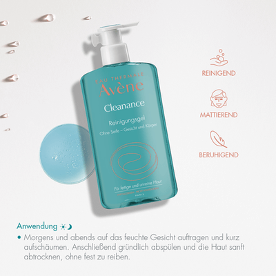 • Reinigen Sie Ihr Gesicht morgens UND abends mit Avène-Reinigungsgel, um überschüssigen Talg zu entfernen. Dieser sammelt sich während des Tages und über Nacht auf der Haut an.
