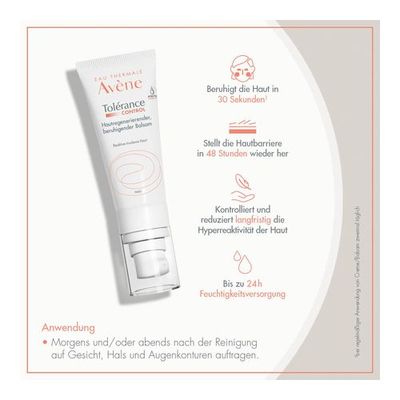 Morgens und/oder abends nach der Reinigung (z.B. mit der Eau Thermale Avène Tolérance Reinigungslotion) auf Gesicht, Hals und Augenkonturen auftragen.