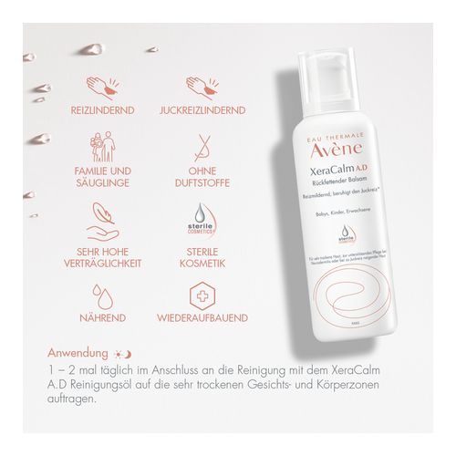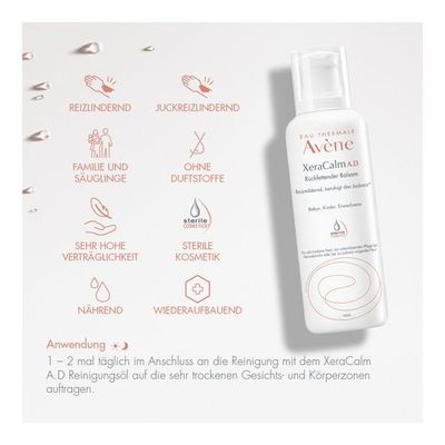 Der Avène XeraCalm A.D Balsam zeichnet sich durch seinen sterilen Pumpspender aus, der eine einfache Dosierung und hygienische Entnahme ermöglicht und für eine hohe Verträglichkeit sorgt. Die hochverträgliche Gesichts- und Körperpflege ist bereits für Babys ab 1 Monat geeignet. Der Balsam wird steril hergestellt sowie abgefüllt und ist ohne Duft- und Konservierungsstoffe. Besonders ist der Balsam bei sehr trockener Haut, atopischen Hautzuständen, zu Neurodermitis neigender Haut oder Altersxerose geeignet.