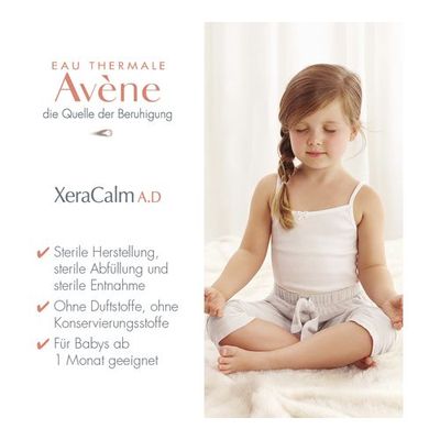 Die Avène XeraCalm A.D Pflegeserie ist speziell für die extrem trockene und zu Neurodermitis neigende Haut konzipiert worden. Sie beruhigt die Haut, wirkt stark rückfettend und lindert den quälenden Juckreiz, unter dem vor allem Neurodermitis-Patienten sehr leiden. Von der Reinigung bis zur Pflege und Intensivpflege bietet Avène XeraCalm A.D genau die richtigen Formulierungen für die angegriffene und strapazierte, trockene Haut. Der Säureschutzmantel wird schnell wiederaufgebaut und die Haut mit Nährstoffen und Feuchtigkeit versorgt. Zusätzlich entspannt der sehr hohe Anteil an Avène Thermalwasser die Haut und beruhigt sie dank der reizlindernden und entzündungshemmenden Eigenschaften. Alle Produkte haben hochverträgliche Formulierungen, um das Risiko von allergischen Reaktionen zu minimieren. Durch die sterile Herstellung und die sterile Entnahme aufgrund des sterilen Verschlusses bei Creme, Balsam und Anti-Juckreiz Konzentrat wird der Tubeninhalt zusätzlich vor eindringenden Keimen geschützt und somit kann auf Konservierungsstoffe und Duftstoffe verzichtet werden. Eine maximale Hautverträglichkeit ist garantiert.