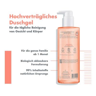 Ein reinigendes, nicht austrocknendes Gel für empfindliche, trockene bis sehr trockene Haut, das für die ganze Familie ab Geburt geeignet ist. Eine verträgliche Tagesreinigung mit leichtem Duft, die die Haut sanft reinigt und für ein angenehmes Hautgefühl sorgt. Dieses Duschgel für Gesicht und Körper besteht zu 99 % aus Inhaltsstoffen natürlichen Ursprungs und ist selbst für die empfindlichste Haut geeignet. Die seifenfreie Gel-Textur ist pH-neutral für die Haut, schäumt beim Auftragen und brennt nicht in den Augen oder im äußeren Intimbereich.