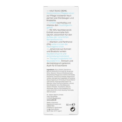 HAUT RUHE CREME ein- bis mehrmals täglich auf die Hautbereiche, die einer besonders intensiven Pflege bedürfen (häufig z. B. im Bereich von Knie- und Ellenbeugen), auftragen und leicht einmassieren. Ein leichter Ölfilm schützt vor erneutem Austrocknen.