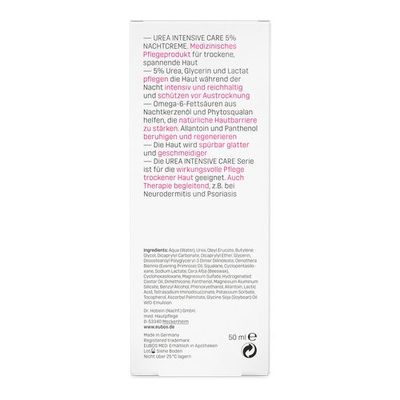 • 5% Urea, Glycerin und Lactat pflegen die Haut während der Nacht intensiv und reichhaltig und schützen vor Austrocknung
