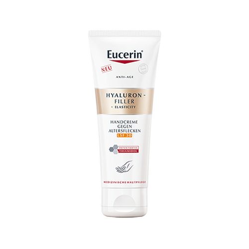 Die Eucerin Hyaluron Filler + Elasticity Handcreme ist eine feuchtigkeitsspendende Handpflege für reife Haut. Dank des patentierten Wirkstoffs Thiamidol kann sie nicht nur Altersflecken mildern, sondern beugt auch der Neuentstehung vor. Altersflecken werden nachweislich bei regelmäßiger Anwendung auf der Hand gemildert. Die Anti Age Hautcreme zieht schnell ein und versorgt die Haut bis zu 24 Stunden mit intensiver Feuchtigkeit – für ein weiches Hautgefühl. Zudem beugt die Handcreme dank LSF 30 der Entstehung neuen, sonnenbedingten Altersflecken vor. Für geschmeidige Hände verbessert die Anti Aging Creme die Elastizität und Festigkeit der Haut. Erste Ergebnisse der Anti Age Creme sowie eine Minderung der Altersflecke sind bereits nach 2 Wochen sichtbar.
