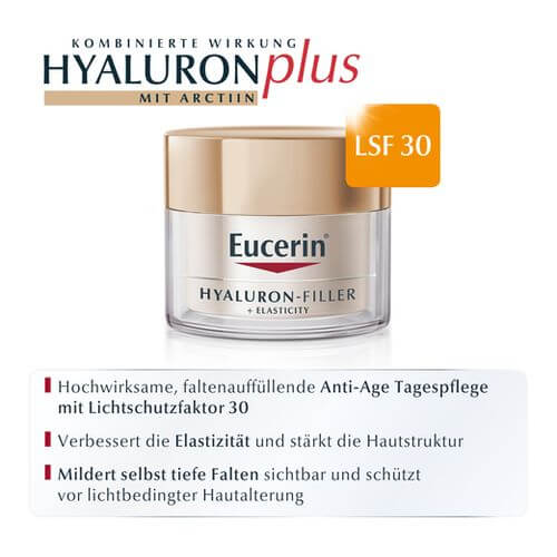 Die Eucerin Hyaluron-Filler + Elasticity Tagespflege ist als Tagescreme für reife Haut entwickelt, um tiefe Falten zu mildern und die Elastizität der Haut zu verbessern. Durch die Kombination verschiedener Wirkstoffe wirkt die Gesichtscreme gleich mehrfach gegen die Zeichen der Hautalterung. Arctiin beschleunigt den Erneuerungsprozess des Kollagens in den Hautzellen, während die Formel mit dem Öl der Mariendistel die Haut mit Feuchtigkeit versorgt und sie intensiv pflegt. Zusätzlich enthält die Antifaltencreme neben langkettiger auch kurzkettige Hyaluronsäure, welche in tiefere epidermale Hautschichten eindringt und zur Milderung selbst ausgeprägter Falten beiträgt. Außerdem kann die Hyaluroncreme auch ideal als Make-up-Grundlage/Primer verwendet werden.
