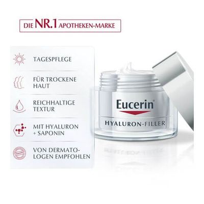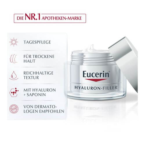 Erstmals hat Eucerin® hochkonzentriertes Saponin in eine kosmetische Formel eingearbeitet. Saponin redynamisiert tiefenwirksam die Produktion hauteigener Hyaluronsäure, so dass das Bindegewebe auf natürliche Weise wieder aufgepolstert wird. Selbst tiefe Falten werden von innen aufgefüllt und dadurch sichtbar gemildert. Als zweiten aktiven Wirkstoff enthält die Creme reine Hyaluronsäure. Dadurch werden die obersten Hautschichten sofort mit Hyaluronsäure versorgt, und es kommt zu einer sofort sichtbaren Glättung der Trockenheitsfältchen.