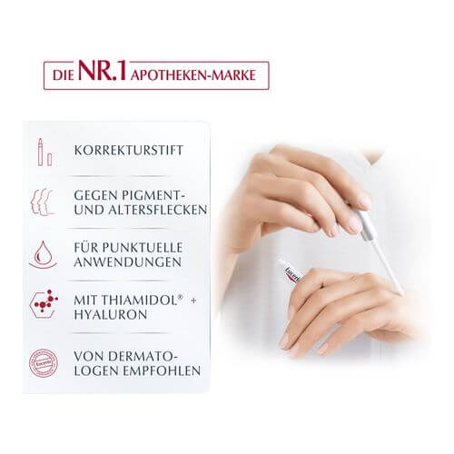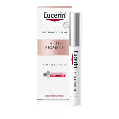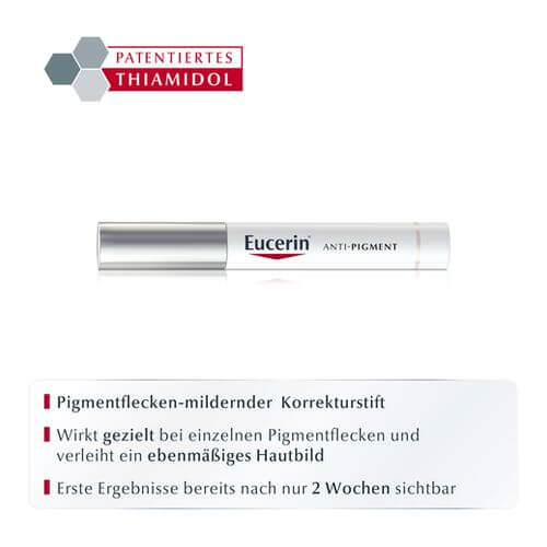 Der Eucerin Anti-Pigment Korrekturstift ist speziell für die Behandlung einzelner Pigmentflecken und sogenannter Altersflecken geeignet. Die Formel mit patentiertem Thiamidol® wirkt Pigmentflecken am Ursprung entgegen, mildert diese bei regelmäßiger Anwendung und verhindert, dass neue Flecken entstehen. Der Haut wird so ein gleichmäßigerer Hautton verliehen.