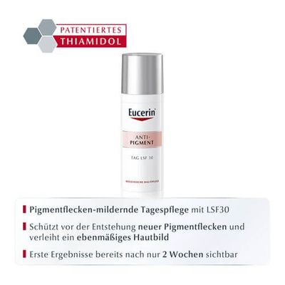 Die Eucerin Anti-Pigment Tagespflege LSF 30 mit leichter, schnell einziehender Textur hilft wirksam bei Pigmentflecken und sogenannte Altersflecken. Der patentierte Wirkstoff Thiamidol® wirkt effektiv am Ursprung von Pigmentflecken und trägt bei regelmäßiger Anwendung sichtbar zu deren Milderung bei. Zusätzlich schützt die Hautpflege durch den enthaltenen LSF 30 vor der Entstehung neuer Flecken. Der Haut wird so ein strahlenderes Aussehen und ein ebenmäßigerer Hautton verliehen.