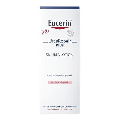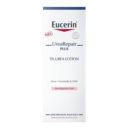 Die Eucerin UreaRepair PLUS Lotion 5% mit beruhigendem Duft ist eine hochwirksame Pflegecreme bei sehr trockener, rauer und gespannter Haut. Mit der Körperlotion wird die Haut 48 Stunden langanhaltend vor Trockenheit geschützt und die Anzeichen trockener Haut werden gelindert. Als Wasser-in-Öl Emulsion zieht die leichte Lotion schnell ein, macht die Haut glatt sowie geschmeidig und stärkt ihre Widerstandskraft.