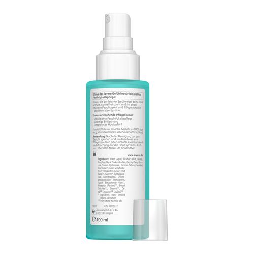 Das Hydro Refresh Gesichts-Pflegespray von Lavera bringt den Feuchtigkeitsgehalt der Haut auf natürliche Weise ins Gleichgewicht. Die effektive und gut verträgliche Formel füllt die Feuchtigkeitsdepots der Haut auf und stärkt so die Barrierefunktion der Haut. Spüre, wie der leichte Sprühnebel unseres Gesichts-Pflegesprays deine Haut umhüllt, schnell einzieht und ihr dabei intensive Feuchtigkeit und Pflege schenkt - ab dem ersten Sprühen.