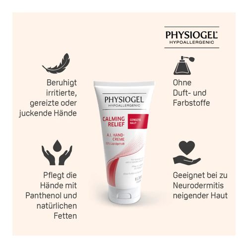 Die PHYSIOGEL® Calming Relief A.I. Handcreme wurde speziell für irritierte, gereizte oder juckende Hände entwickelt, damit die Hände werden, wie sie sein sollen. Besonders bei häufigem Händewaschen oder Desinfektion ist das Eincremen der Hände wichtig. Die Creme pflegt die Hände mit Panthenol und natürlichen Fetten und enthält juckreizmilderndes & entzündungshemmendes PEA.