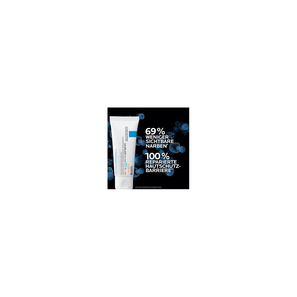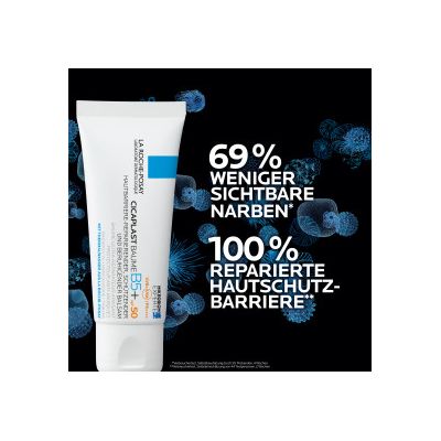 Der Wundpflege-Balsam CICAPLAST BAUME B5+ LSF 50 von La Roche Posay beruhigt oberflächliche Hautirritationen und pflegt die Haut dank einer multifunktionalen Formulierung mit Lichtschutzfaktor 50 vor der Entstehung von dunklen Narben. Die beruhigenden und regenerierenden Inhaltsstoffe Panthenol (Vitamin B5), Madecassoside, ein einzigartiger präbiotischen Tribioma Komplex und patentiertes Procerad sorgen für eine effektive Pflege. Die schützenden UVA- und UVB-Filter beugen einer UV-induzierten Hyperpigmentierung vor, sodass die Haut nicht zusätzlich geschädigt wird.
