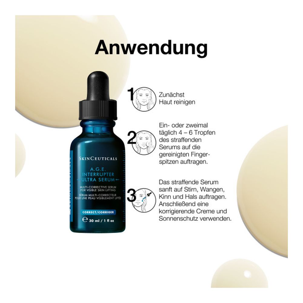 1. Morgens: Bei Anwendung am Morgen zuerst gründlich das Gesicht reinigen und ein SkinCeuticals Vitamin-C-Serum auftragen und einwirken lassen. Dann 4-6 Tropfen des A.G.E. Interrupter Ultra Serums auf die gereinigten Fingerspitzen geben und sanft auf Stirn, Wangen, Kinn und Hals auftragen. Nach kurzer Einwirkzeit die Gesichtspartien mit einer SkinCeuticals Feuchtigkeitscreme und/oder einem Sonnenschutz eincremen. 2. Abends: Nach der Gesichtsreinigung eine Pipette des A.G.E. Interrupter Ultra Serums sanft auf die betreffenden Gesichtspartien auftragen.
