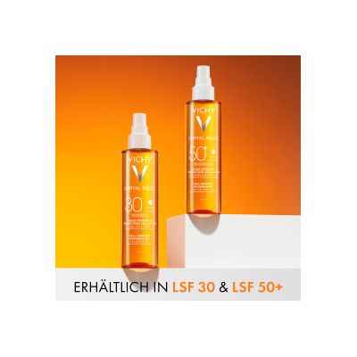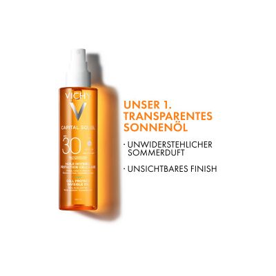 Das CAPITAL SOLEIL Cell Protect Oil mit Lichtschutzfaktor 30 ist das erste transparente Sonnenöl aus dem Hause Vichy. Es schützt zuverlässig vor UVA- und UVB-Strahlen und kann im Gesicht, auf dem Körper und auf Haar und Kopfhaut angewendet werden. Mit seiner ultraleichten Textur verleiht das Sonnenöl der Haut einen wunderschönen Glow sowie einen unwiderstehlichen Duft nach Sommer. Das Finish des Cell Protect Oil ist unsichtbar und hinterlässt keine weißen Spuren auf der Haut. Die Formel enthält zum einen Vitamin E, das die Haut beruhigt, Oxidation verhindert und die Hautschutzbarriere schützt. Zum anderen ist Squalan enthalten, was der Haut einen Feuchtigkeitsboost verleiht."