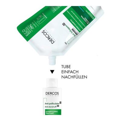 Praktische 500ml Nachfüllpackung des VICHY DERCOS Anti-Schuppen Shampoo für fettige Kopfhaut.