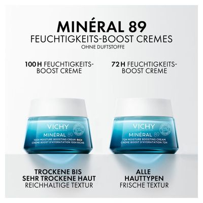 Erleben Sie Feuchtigkeit, wie Sie sie noch nie erlebt haben: Vichy MINÉRAL 89 Creme ist die optimale Ergänzung zum beliebten MINÉRAL 89 Hyaluron-Booster. Der innovative Wirkstoffkomplex aus Mineralien, langkettiger Hyaluronsäure, Niacinamid (B3) sowie Squalan und Lipiden spendet trockener Haut einen sofortigen Feuchtigkeits-Boost. Die Creme wirkt wie eine zweite Haut, die die Hautschutzbarriere stärkt und regeneriert. Die Feuchtigkeitscreme für das Gesicht Vichy MINÉRAL 89 Creme setzt auf eine minimalistische Formel, die ohne Duftstoffe, Alkohol und Silikone auskommt. So eignet sich die feuchtigkeitsspendende Gesichtscreme insbesondere für empfindliche Haut.