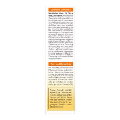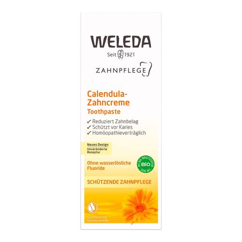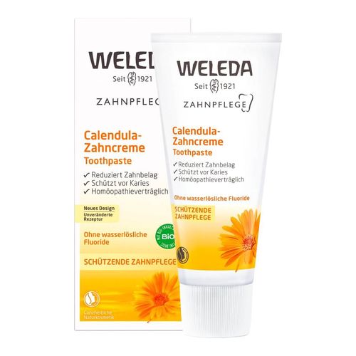 Die mentholfreie Weleda Calendula-Zahncreme ist konzipiert für Menschen, die auf Pfefferminzöl verzichten möchten - zum Beispiel während einer homöopathischen Behandlung. Mildes ätherisches Fenchelöl gibt, als Alternative zum klassischen Pfefferminzgeschmack, ein frisches Mundgefühl. Ein mineralischer Putzkörper aus Calciumcarbonat (Kreide) reinigt die Zähne sanft und gründlich. Durch regelmäßiges Putzen mit der Weleda Calendula-Zahncreme wird Zahnbelag zuverlässig entfernt und so Karies vorgebeugt. Ein Auszug aus beruhigender Calendula beugt Irritationen vor und hilft, den gesamten Mundraum gesund zu halten.