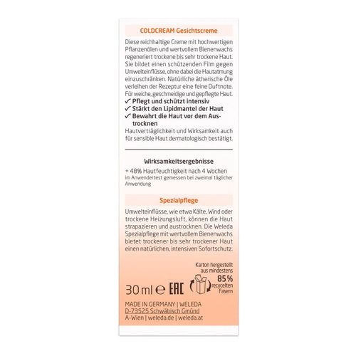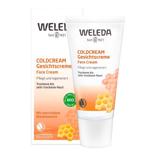 Bewährter Schutz vor belastenden Umwelteinflüssen: die reichhaltige Weleda Coldcream stärkt den Lipidmantel und pflegt trockene bis sehr trockene Haut intensiv. Reine Pflanzenöle und wertvolles Bienenwachs stärken den Lipidmantel und bewahren so die zarte Gesichtshaut vor dem Austrocknen. Natürliche ätherische Öle geben der Weleda Coldcream die feine Duftnote. Die Haut fühlt sich wieder weich und geschmeidig an und sieht gepflegt aus. Die Verträglichkeit der Weleda Coldcream ist dermatologisch bestätigt. Was bedeutet Coldcream? Der Begriff Coldcream klingt nach Kälte. Tatsächlich handelt es sich dabei aber um die traditionelle Bezeichnung für Creme-Rezepturen mit Bienenwachs und besonders hohem Fettanteil, die beim Verteilen auf der Haut einen kühlenden Effekt haben. Bereits in der Antike wurde eine Creme hergestellt, die als Vorfahr der Coldcream gilt. Wie damals enthält die Weleda Coldcream natürliche Pflanzenöle und Bienenwachs. Wertvolles echtes Rosenöl verleiht ihr einen feinen Duft.