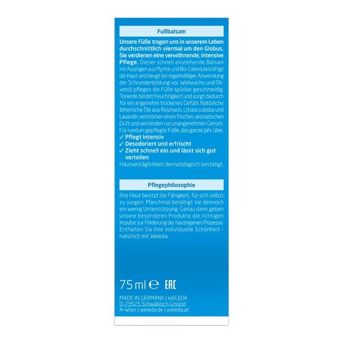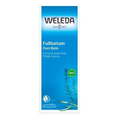 Unsere Füße tragen uns durchschnittlich viermal in unserem Leben um den Globus. Mit dem Weleda Fußbalsam als Begleiter fühlen sich Ihre Füße rundum gepflegt an. Die feine Komposition aus stärkendem Myrrhe- und beruhigendem Calendulaextrakt kräftigt die Haut und beugt somit bei regelmäßiger Anwendung der Hornhaut- und Schrundenbildung vor. Tonerde bindet Feuchtigkeit und sorgt dadurch für ein angenehm trockenes Fuß-Klima. Wollwachs und Olivenöl pflegen selbst beanspruchte Haut geschmeidig weich. Echte ätherische Öle verströmen einen erfrischenden Duft, desodorieren und haben einen angenehm kühlenden Effekt auf der Haut.