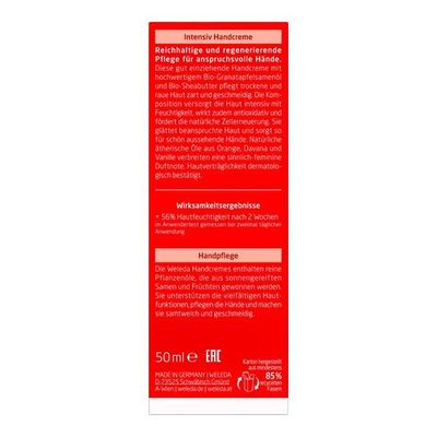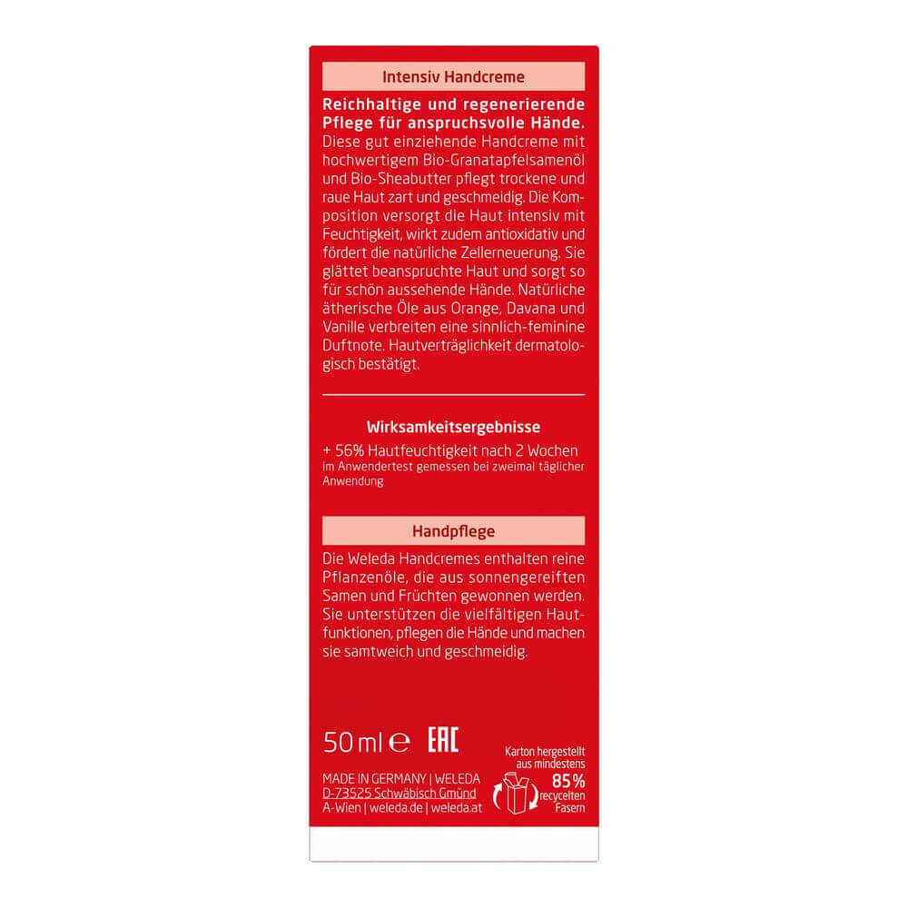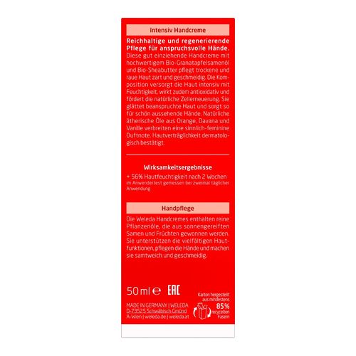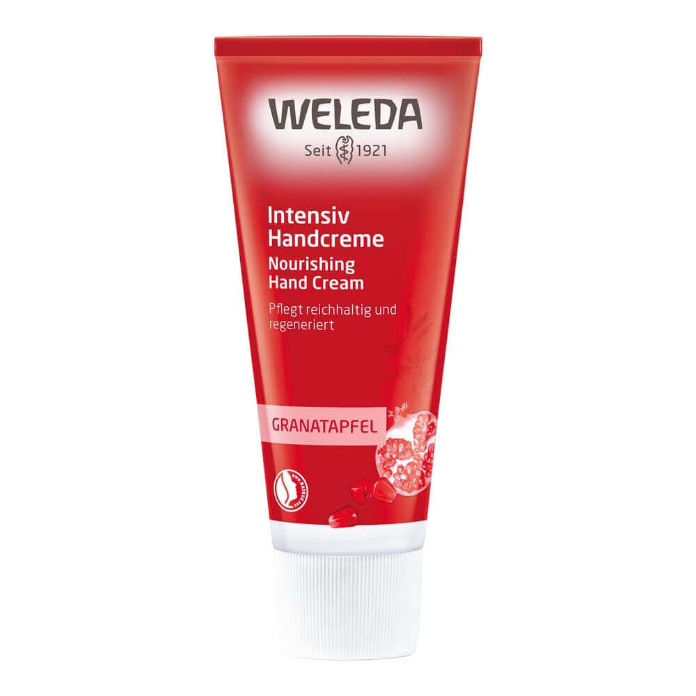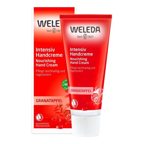 Die Weleda Granatapfel Intensiv Handcreme pflegt Ihre Hände spürbar glatt und geschmeidig. Die gut einziehende Creme schützt durch den antioxidativen Wirkstoffkomplex vor vorzeitiger Hautalterung und beugt somit auch der Bildung von altersbedingten Pigmentflecken vor. Hochwertiges Granatapfelsamenöl wirkt antioxidativ und fördert die Regeneration der Zellen. Die besonders beanspruchten Hände werden aktiv vor schädlichen Umwelteinflüssen geschützt. Reines Sesamöl und natürliche Sheabutter bewahren die Haut vor Feuchtigkeitsverlusten und pflegen die Hände spürbar weicher. Extrakte aus kieselsäurereicher Goldhirse unterstützen die Festigkeit und Elastizität der Haut. Die einzigartige Gesamtkomposition lässt Ihre Haut deutlich glatter und straffer erscheinen. Natürliche ätherische Öle aus Orange, Davana und Vanille verbreiten einen sinnlich-femininen Duft.