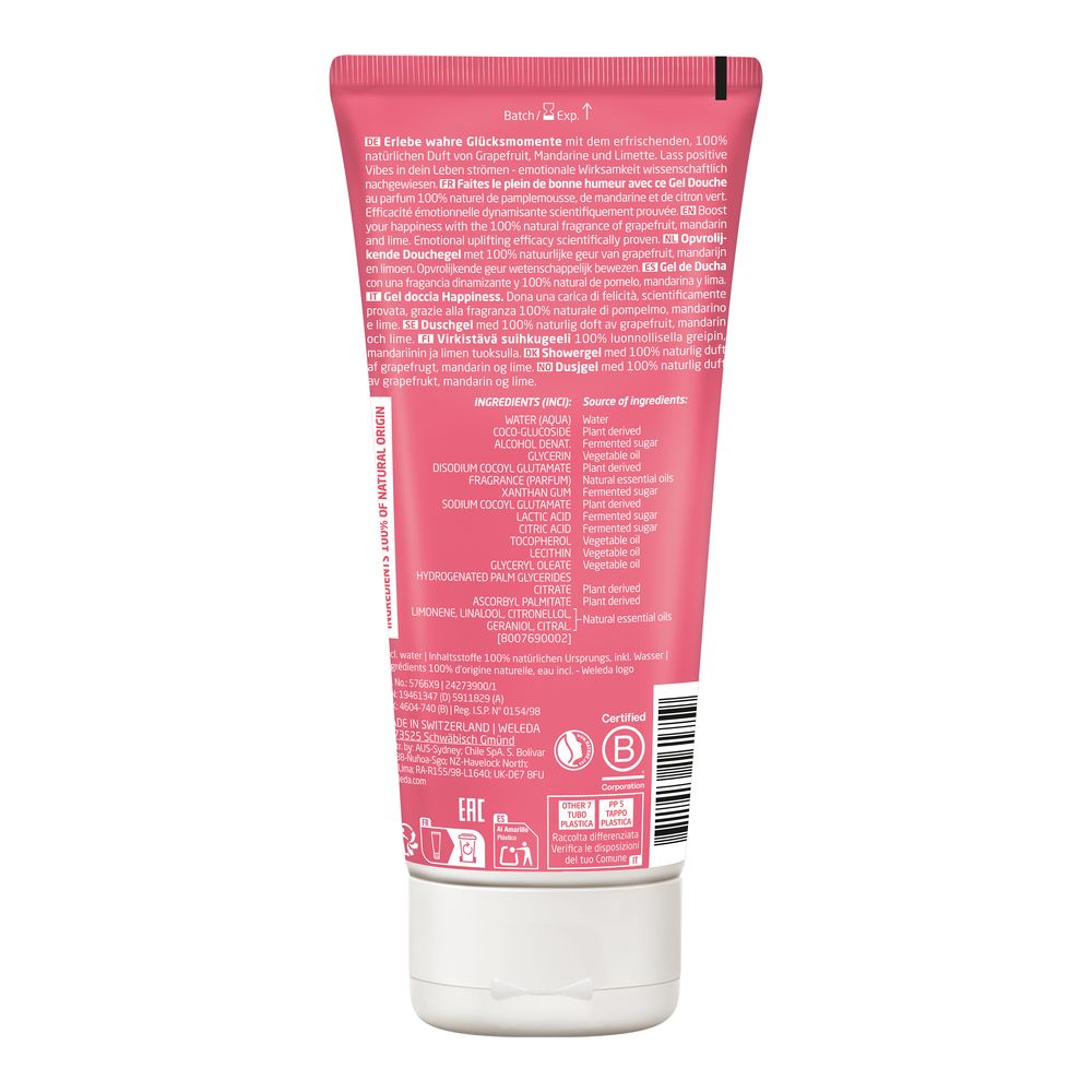 Gönn dir einen echten Glücks-Kick für Körper und Seele: Das Weleda Happiness Shower Gel Grapefruit mit 100 % natürlichem Duft aus frischer Grapefruit, spritziger Mandarine und belebender Limette hebt nachweislich die Stimmung und schenkt dir neue Energie. Die fruchtige, zitrusfrische Komposition wirkt aktivierend, hellt die Sinne auf und verleiht dir ein Gefühl innerer Leichtigkeit – ideal für graue Tage, müde Morgen oder kleine Auszeiten zwischendurch.