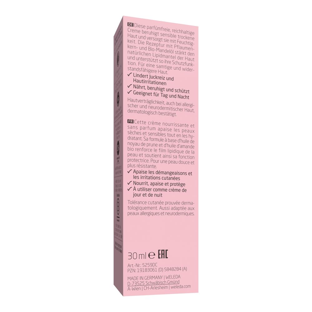 Sie ist ein echter Lichtblick, wenn du zu sensibler, trockener Haut neigst: die parfümfreie, reichhaltige Weleda Sensitiv Feuchtigkeitscreme Mandel mit nur neun Inhaltsstoffen. Sie ist gibt deiner Haut, was genau sie braucht. Dabei ist sie ganz sanft zu deiner Haut, beruhigt sie, versorgt sie mit Feuchtigkeit und stärkt die Hautbarriere. Die bewährte Rezeptur mit Pflaumenkern- und Bio-Mandelöl unterstützt den natürlichen Lipidmantel deiner Haut und verstärkt so ihre Schutzfunktion. Deine Haut wird widerstandsfähiger, Juckreiz und Hautirritationen werden gelindert. Du kannst sie als Tages- und Nachtcreme verwenden.