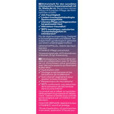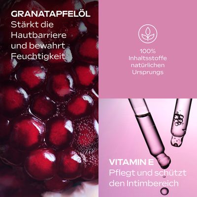 Die pflegende Mischung aus Granatapfelsamenöl, Rizinusöl, Jojobaöl, Sonnenblumenöl und Vitamin E beruhigt und nährt die Haut nachhaltig. Die mikrobiofreundliche Formel respektiert das natürliche Gleichgewicht des Intimbereichs, zieht schnell ein und hinterlässt keinen Fettfilm – für ein sofort entspanntes Hautgefühl.